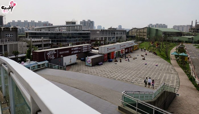 從3樓的平台往下拍,是一排的貨櫃屋商店。